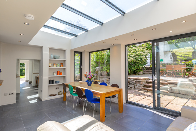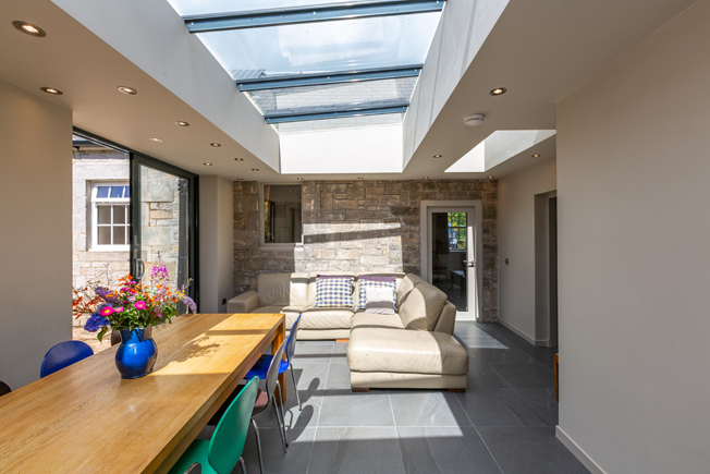 The challenge was to create a room, which would function as a dining room and seating space, optimising views of the garden as well as linking several rooms in the original house. We wanted as much light as possible in this space and the kitchen beyond. The new roof also had to fit beneath the overhangs of the neighboring three slate roofs. We wanted a contemporary design, which would complement the original building. This was achieved with a mix of materials – large glass windows, doors and roof-lights with dark grey aluminium frames, a zinc roof and traditional stonework. Insulation and under-floor heating add warmth.