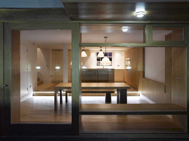 The lower ground is given over to the show-piece kitchen and dining area defined by a change in floor level with an illuminated step.